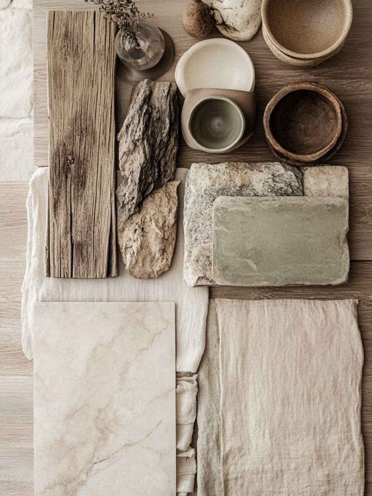 Дерево, бамбук, лен, хлопок, шерсть, глина, керамика — в приоритете всё, что подарено природой. Часто используют необработанные поверхности или материалы с фактурой, которая подчёркивает естественность.