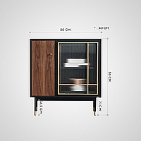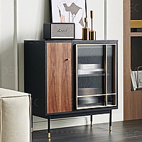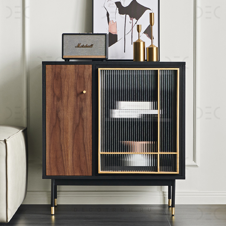 Миниатюрный дизайнерский шкаф из массива дерева с широкой дверцей из рифленого стекла в латунной отделке
