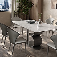 Роскошный обеденный стол BONGO SILVER+CARRARA с глянцевой каменной столешницей и стальным каркасом.